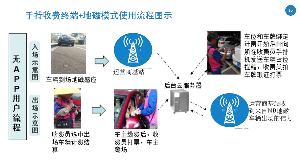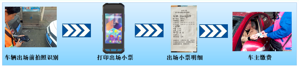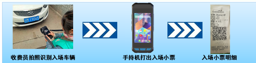 車輛入場——地磁檢測啟動——提交數(shù)據(jù)至后臺——手持端車位報警——手持機掃描車牌(錄入)——打印小票